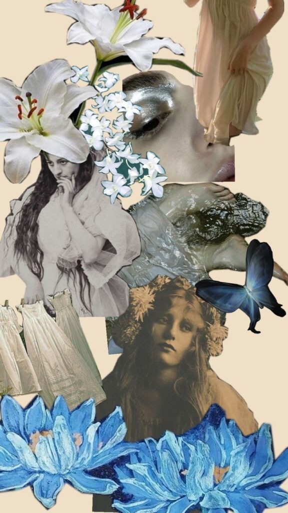 The painting Ophelia (1852) by Sir John Everett Millais depicts a haunting yet serene image of a young woman. Ophelia, floating lifelessly in a pond. She is portrayed as wearing an elaborate gown adorned with gold embroidery. Which adds a sense of opulence and contrast to the somber theme. Her hands float delicately on the water’s surface, holding flowers that contribute to the rich symbolism in the painting. Scattered flowers rest on the water around her, some sinking beneath her flowing dress. Which spreads out like a halo, blending her form with the pond.